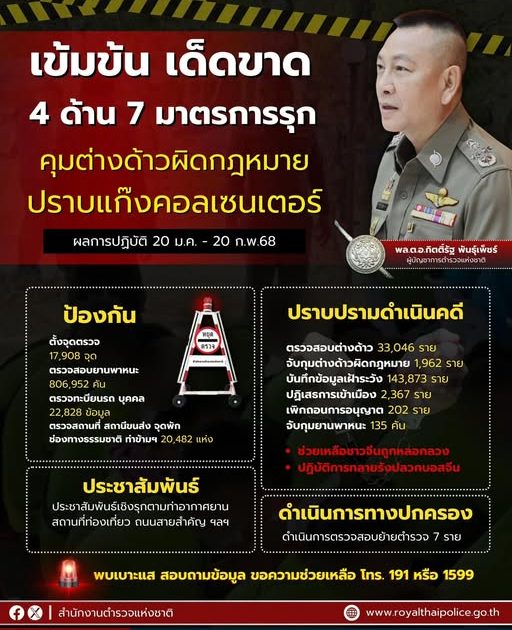พล.ต.อ.กิตติ์รัฐ พันธุ์เพ็ชร์ ผู้บัญชาการตำรวจแห่งชาติ ( ผบ.ตร. ) สั่งการตำรวจทุกหน่วยที่เกี่ยวข้องเดินหน้าปฏิบัติตาม 7 มาตรการ ปราบปรามต่างด้าวผิดกฎหมาย และปราบปรามแก๊งคอลเซนเตอร์