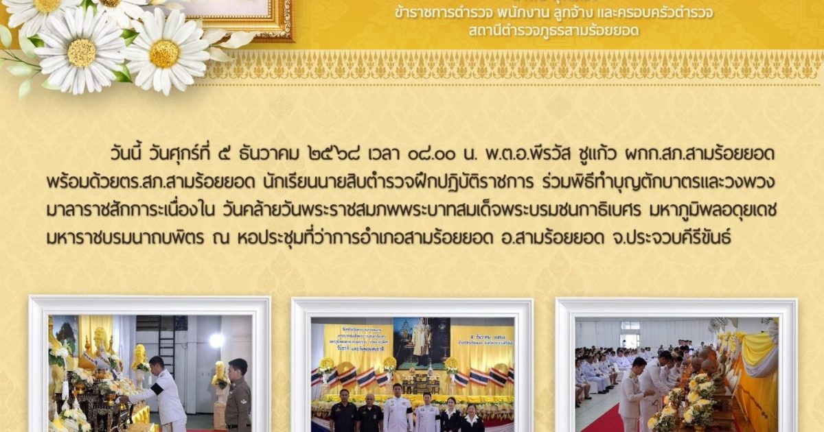 ข้าราชการตำรวจ สภ.สามร้อยยอด ร่วมพิธีทำบุญตักบาตรและวางพวงมาลาราชสักการะ เนื่องในวันคล้ายวันพระราชสมภพ พระบาทสมเด็จพระบรมชนกาทิเบศร มหาภูมิพลอดุลยเดช มหสราชบรมนาถบพิตร