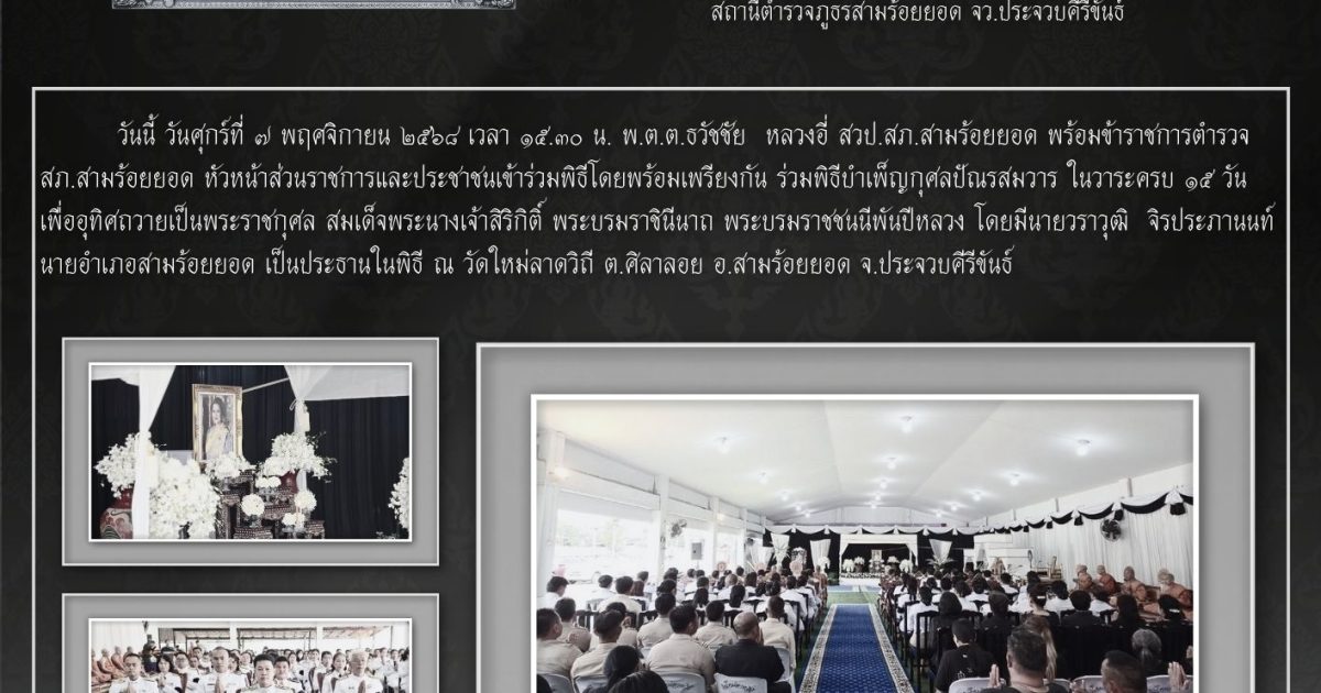 ข้าราชการตำรวจ สภ.สามร้อยยอด ร่วมพิธีบำเพ็ญกุศลปัณรสมวาร ในวาระครบ 15 วัน เพื่ออุทิศถวายเป็นพระราชกุศล สมเด็จพระนางเจ้าสิริกิติ์ พระบรมราชินีนาถ พระบรมราชชนนีพันปีหลวง