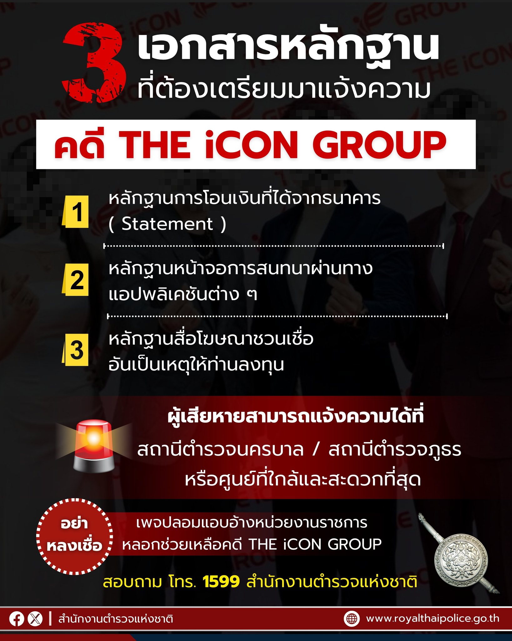 คดี “ดิไอคอนกรุ๊ป” แจ้งความได้ที่ สน. / สภ. ทุกแห่ง หรือศูนย์รับแจ้งความที่ใกล้ และสะดวก