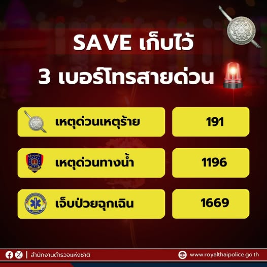 SAVE เก็บไว้ ใช้ยามฉุกเฉิน 3 เบอร์โทรสายด่วน ตำรวจทุกท้องที่ ตำรวจน้ำ สถาบันแพทย์ฉุกเฉินฯ โทร.ได้ตลอ
